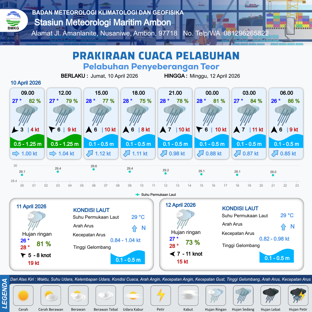 10 Apr 26, 16.00 3 jam kedepan | Tenggara 6 kt Gust Peningkatan kecepatan angin yang singkat dan tiba-tiba : 10 kt | 0.4 m Tenang | Timur Laut 0.9 Knot | 5 km | 28 °C | 81 % | +0.67 m | |