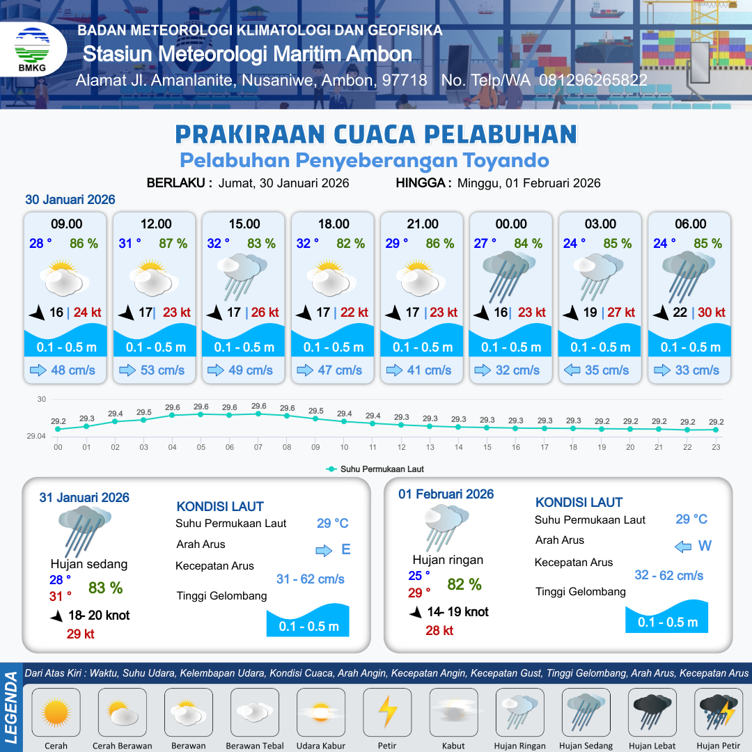 30 Jan 26, 23.00 4 jam kedepan | Hujan Ringan | Barat Laut 19 kt Gust Peningkatan kecepatan angin yang singkat dan tiba-tiba : 29 kt | | | 4 km | 27 °C | 86 % | -1.03 m |