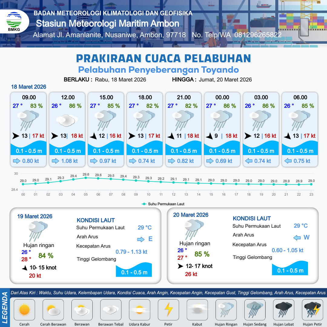 18 Mar 26, 08.00 9 jam kedepan | Barat 13 kt Gust Peningkatan kecepatan angin yang singkat dan tiba-tiba : 17 kt | 0.1 m Tenang | Timur 0.8 Knot | 7 km | 27 °C | 82 % | +0.25 m | |