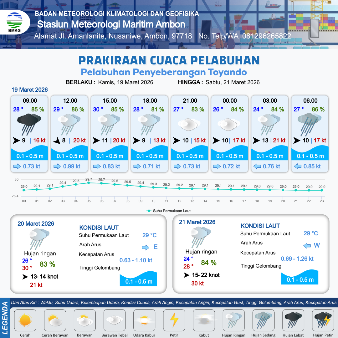 19 Mar 26, 10.00 Saat ini | Barat 9 kt Gust Peningkatan kecepatan angin yang singkat dan tiba-tiba : 20 kt | 0.1 m Tenang | Timur 0.7 Knot | 10 km | 28 °C | 81 % | -0.39 m | |