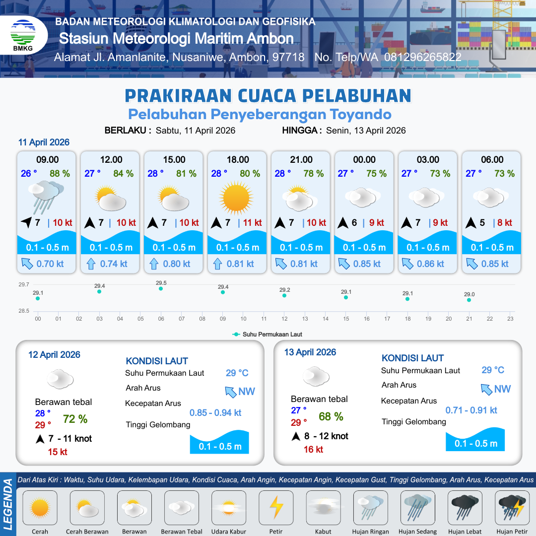 11 Apr 26, 17.00 12 jam kedepan | Selatan 7 kt Gust Peningkatan kecepatan angin yang singkat dan tiba-tiba : 9 kt | 0.3 m Tenang | Barat Laut 0.9 Knot | 10 km | 27 °C | 74 % | +0.66 m | |