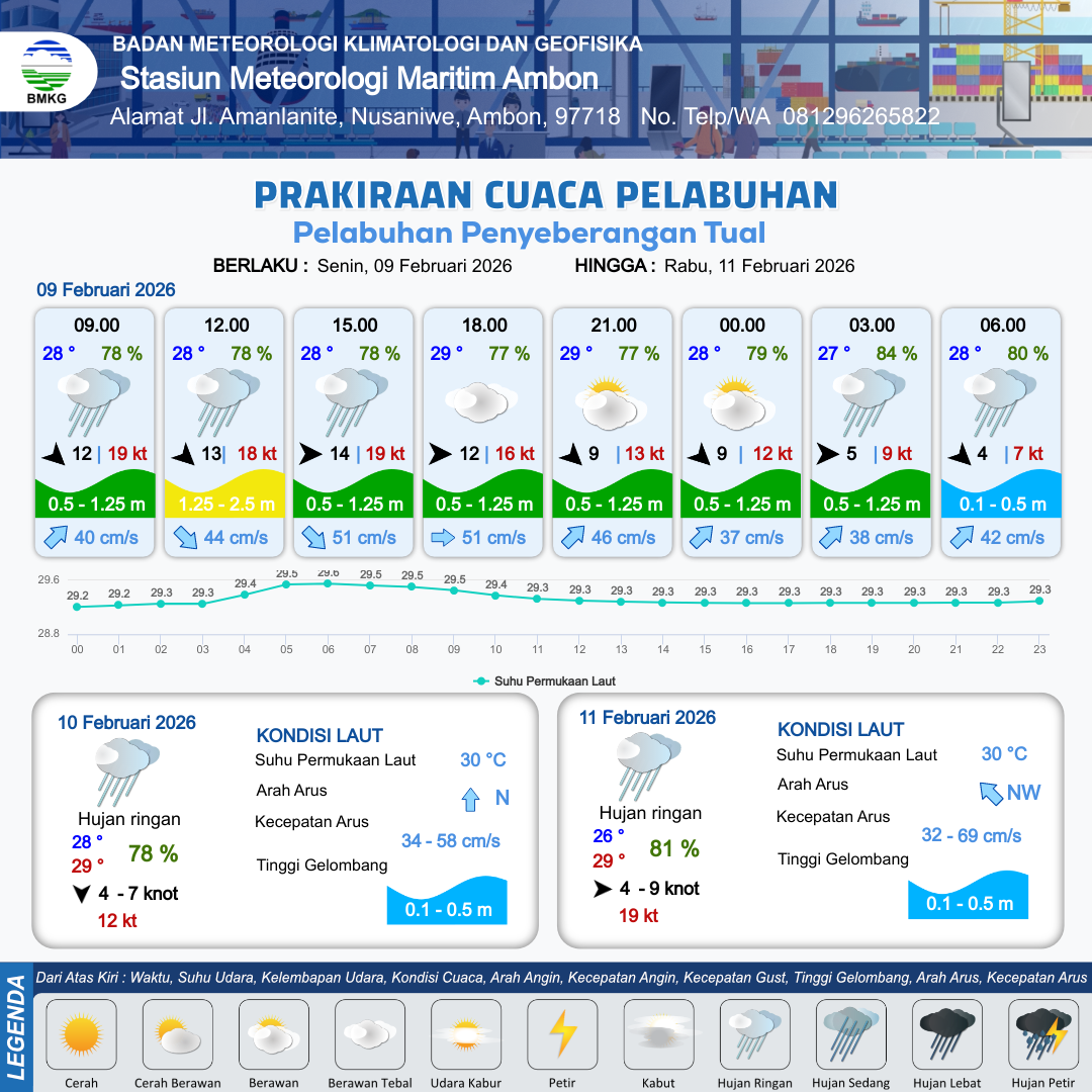 9 Feb 26, 09.00 10 jam kedepan | Barat 12 kt Gust Peningkatan kecepatan angin yang singkat dan tiba-tiba : 16 kt | 0.9 m Rendah | Timur 51.0 cm/s | 10 km | 29 °C | 77 % | +0.71 m | |