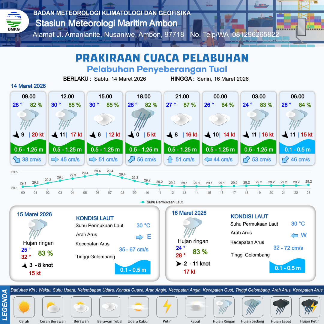 14 Mar 26, 03.00 15 jam yang lalu | Hujan Ringan | Barat Laut 11 kt Gust Peningkatan kecepatan angin yang singkat dan tiba-tiba : 17 kt | | | 7 km | 30 °C | 85 % | +0.32 m |