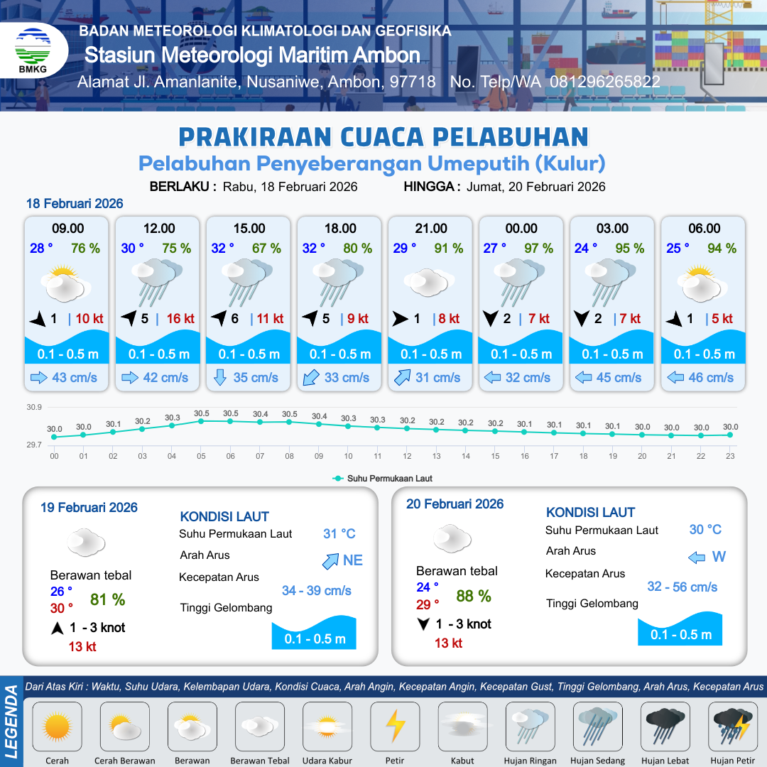 18 Feb 26, 11.00 8 jam yang lalu | Berawan | Barat 1 kt Gust Peningkatan kecepatan angin yang singkat dan tiba-tiba : 7 kt | | | 10 km | 30 °C | 89 % | -0.23 m |