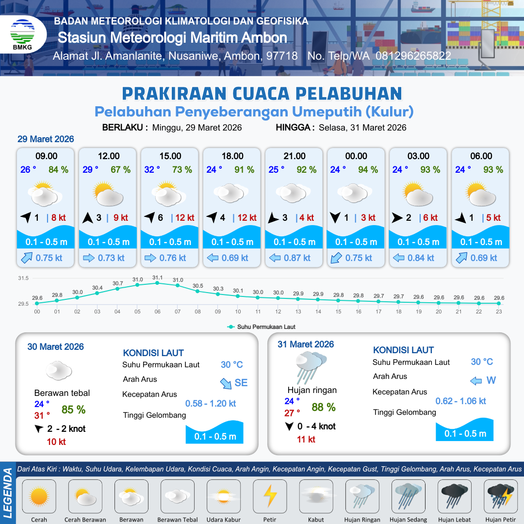 30 Mar 26, 13.00 15 jam kedepan | Barat 12 kt Gust Peningkatan kecepatan angin yang singkat dan tiba-tiba : 3 kt | 0.1 m Tenang | Barat 0.8 Knot | 10 km | 25 °C | 93 % | +0.24 m | |