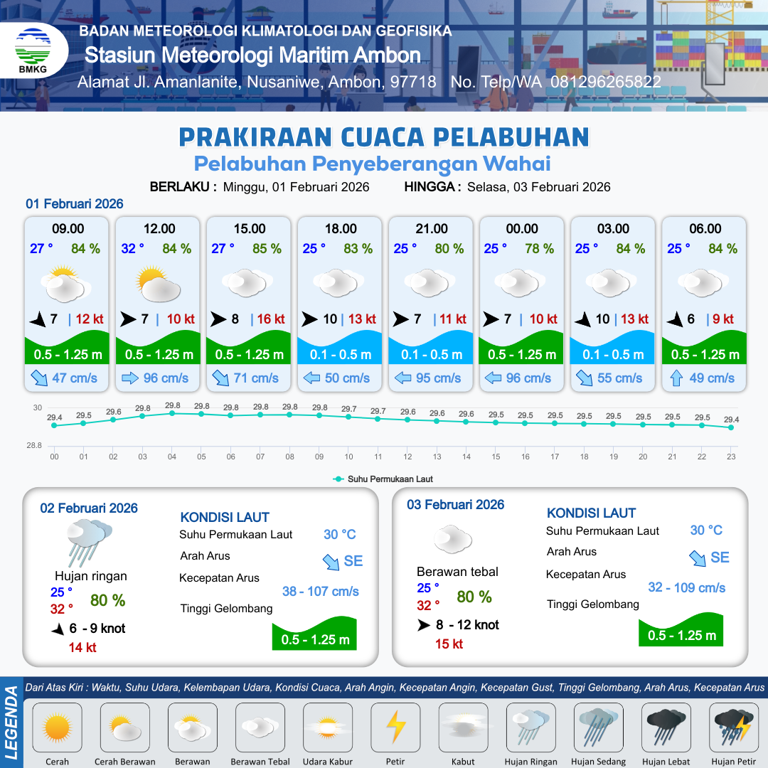 1 Feb 26, 23.00 3 jam kedepan | Hujan Ringan | Barat 6 kt Gust Peningkatan kecepatan angin yang singkat dan tiba-tiba : 17 kt | | | 7 km | 26 °C | 87 % | -0.81 m |