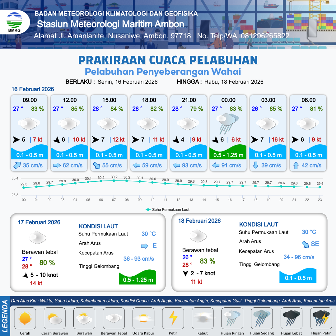 16 Feb 26, 23.00 3 jam kedepan | Berawan Tebal | Barat 5 kt Gust Peningkatan kecepatan angin yang singkat dan tiba-tiba : 9 kt | | | 10 km | 27 °C | 83 % | -0.65 m |