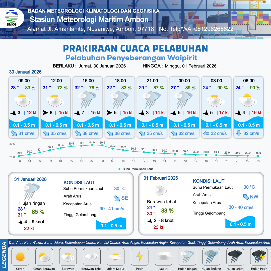 30 Jan 26, 08.00 10 jam kedepan | Barat 5 kt Gust Peningkatan kecepatan angin yang singkat dan tiba-tiba : 16 kt | 0.1 m Tenang | Tenggara 38.0 cm/s | 4 km | 32 °C | 80 % | -0.05 m | |