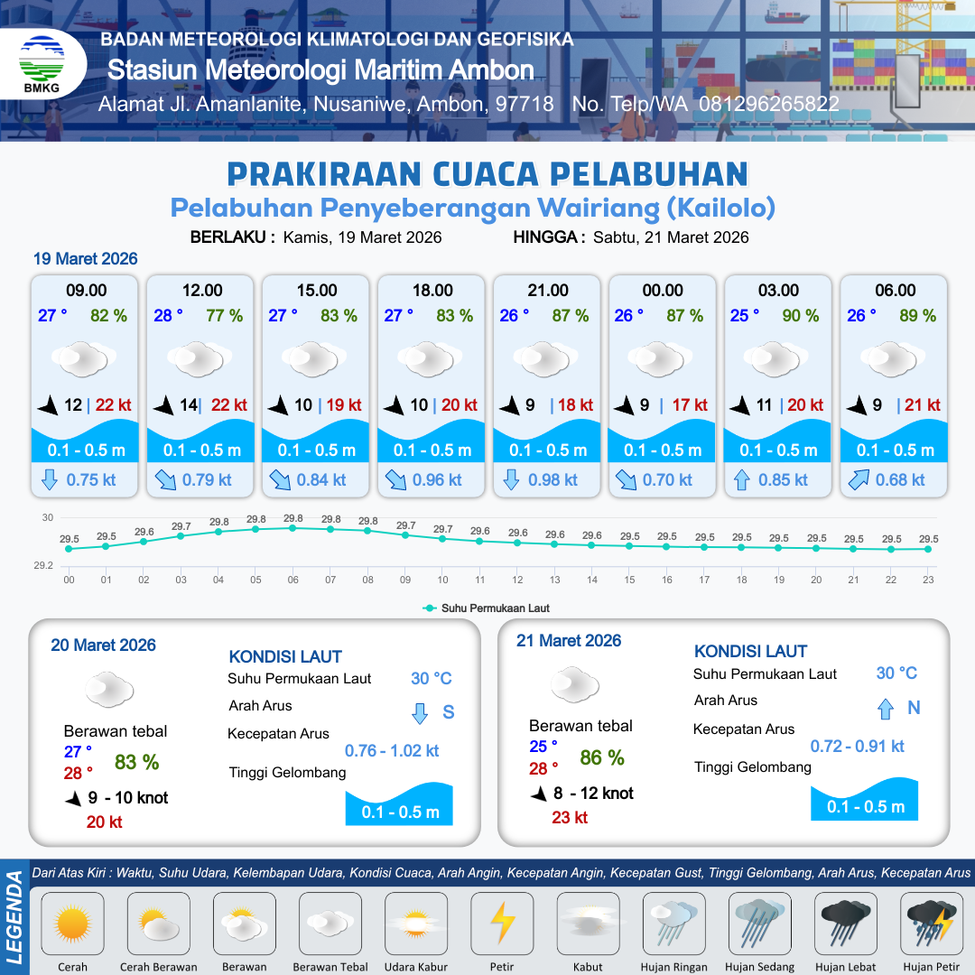 19 Mar 26, 07.00 12 jam yang lalu | Berawan Tebal | Barat Laut 10 kt Gust Peningkatan kecepatan angin yang singkat dan tiba-tiba : 18 kt | | | 8 km | 27 °C | 83 % | +0.69 m |