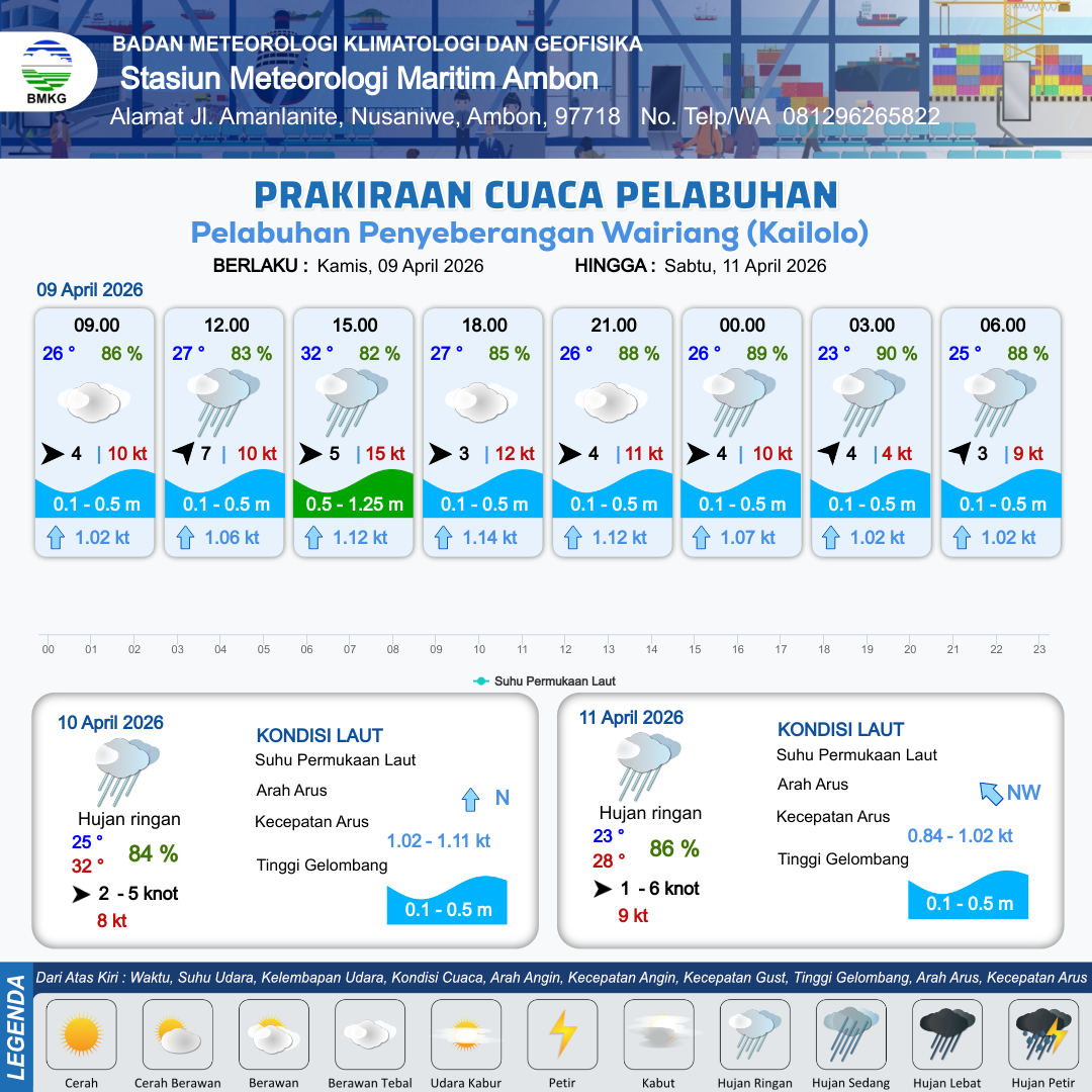 9 Apr 26, 09.00 4 jam kedepan | Barat 3 kt Gust Peningkatan kecepatan angin yang singkat dan tiba-tiba : 12 kt | 0.5 m Rendah | Utara 1.1 Knot | 10 km | 27 °C | 85 % | +0.69 m | |