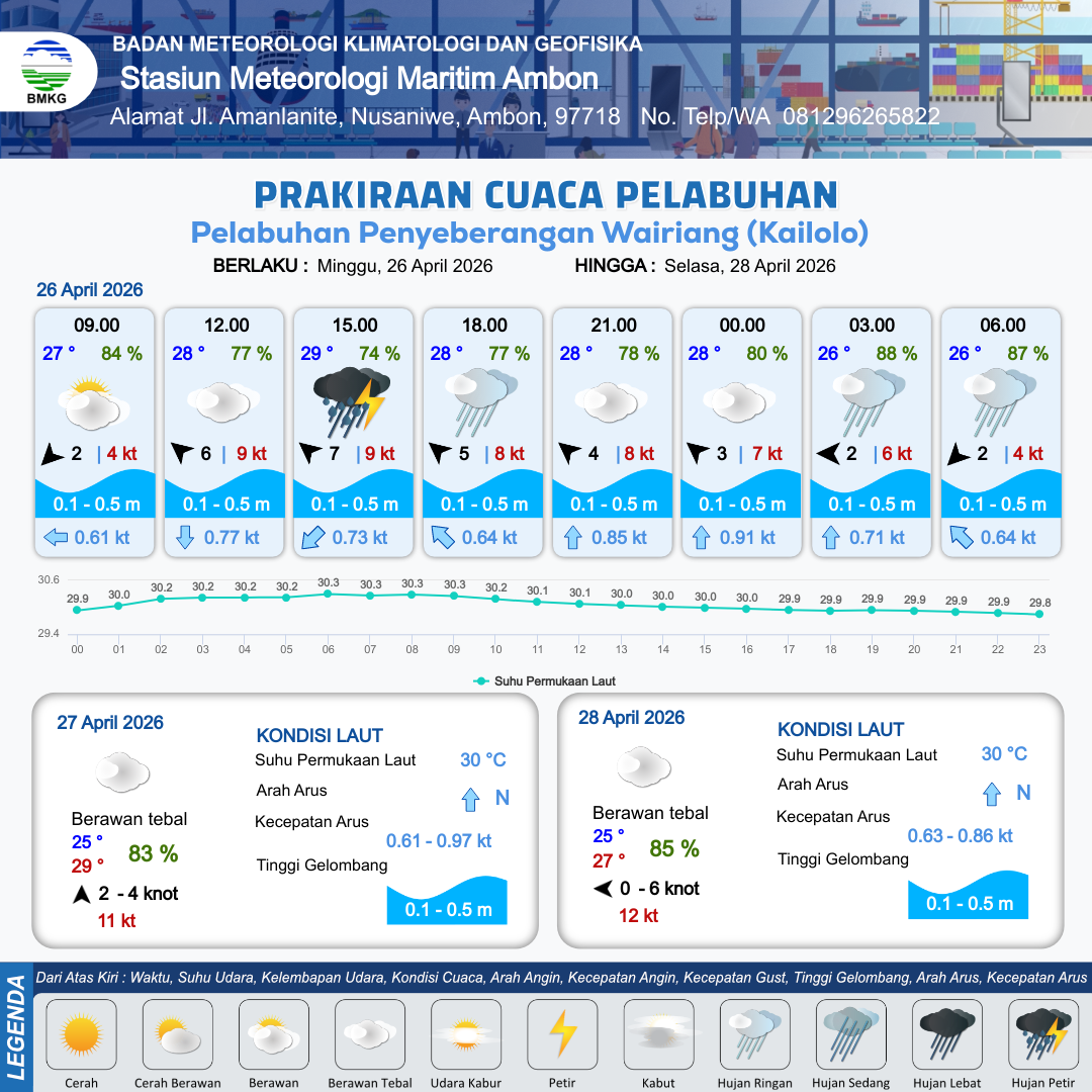 25 Apr 26, 23.00 3 jam kedepan | Berawan | Barat Laut 2 kt Gust Peningkatan kecepatan angin yang singkat dan tiba-tiba : 6 kt | | | 10 km | 26 °C | 87 % | +0.25 m |