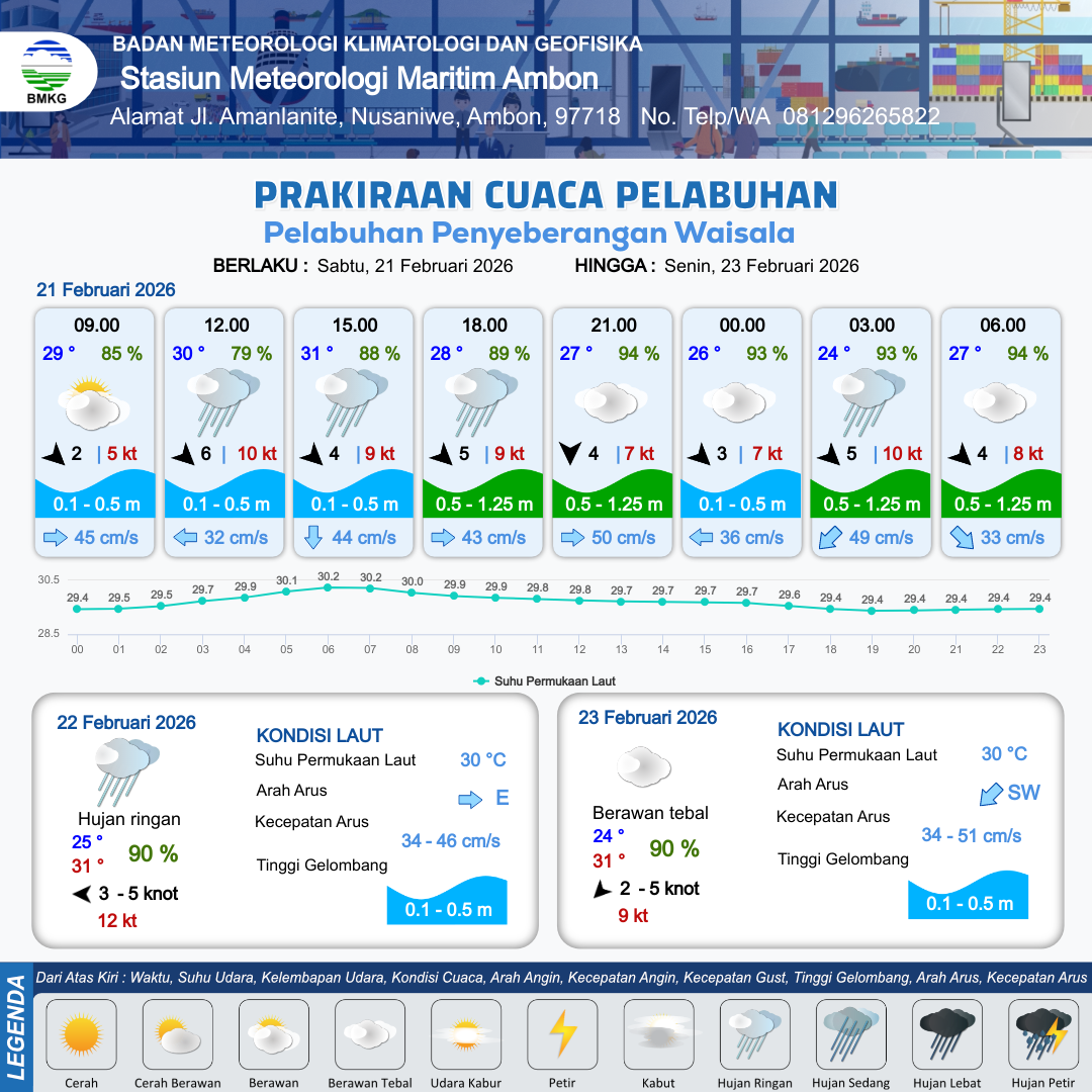 21 Feb 26, 23.00 4 jam kedepan | Hujan Ringan | Utara 3 kt Gust Peningkatan kecepatan angin yang singkat dan tiba-tiba : 9 kt | | | 6 km | 28 °C | 92 % | +0.25 m |