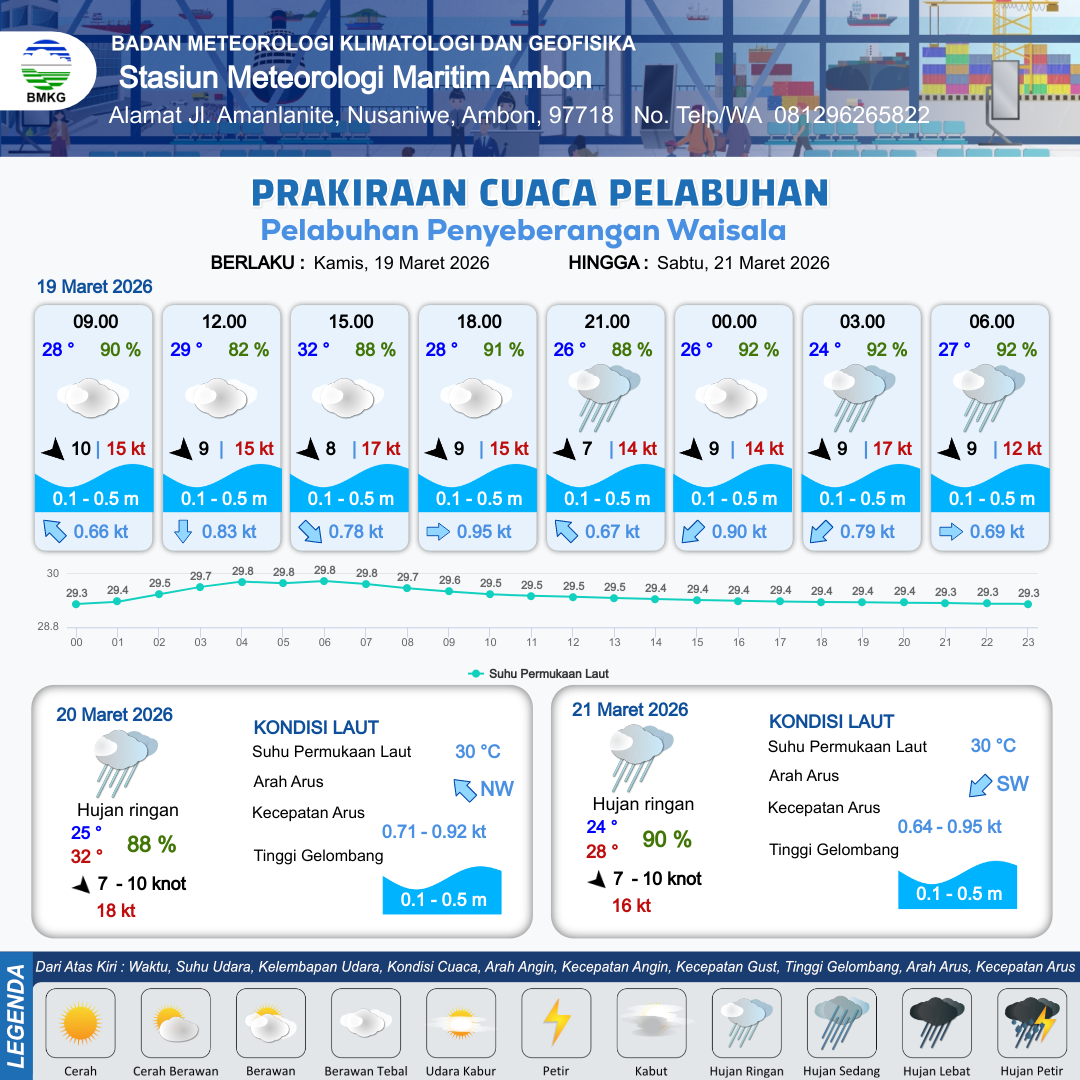 18 Mar 26, 08.00 12 jam yang lalu | Hujan Ringan | Barat Laut 8 kt Gust Peningkatan kecepatan angin yang singkat dan tiba-tiba : 13 kt | | | 7 km | 25 °C | 90 % | +0.30 m |