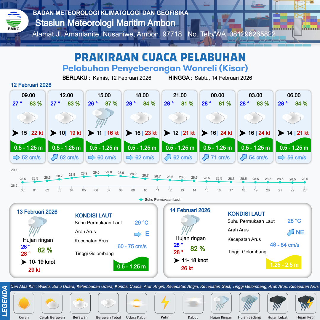 12 Feb 26, 04.00 6 jam kedepan | Barat 10 kt Gust Peningkatan kecepatan angin yang singkat dan tiba-tiba : 17 kt | 0.5 m Rendah | Timur Laut 60.0 cm/s | 10 km | 28 °C | 80 % | +0.05 m | |