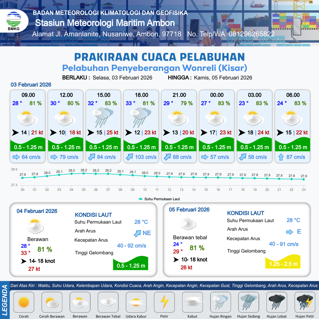 3 Feb 26, 22.00 3 jam kedepan | Berawan | Barat 15 kt Gust Peningkatan kecepatan angin yang singkat dan tiba-tiba : 22 kt | | | 10 km | 26 °C | 81 % | -0.45 m |
