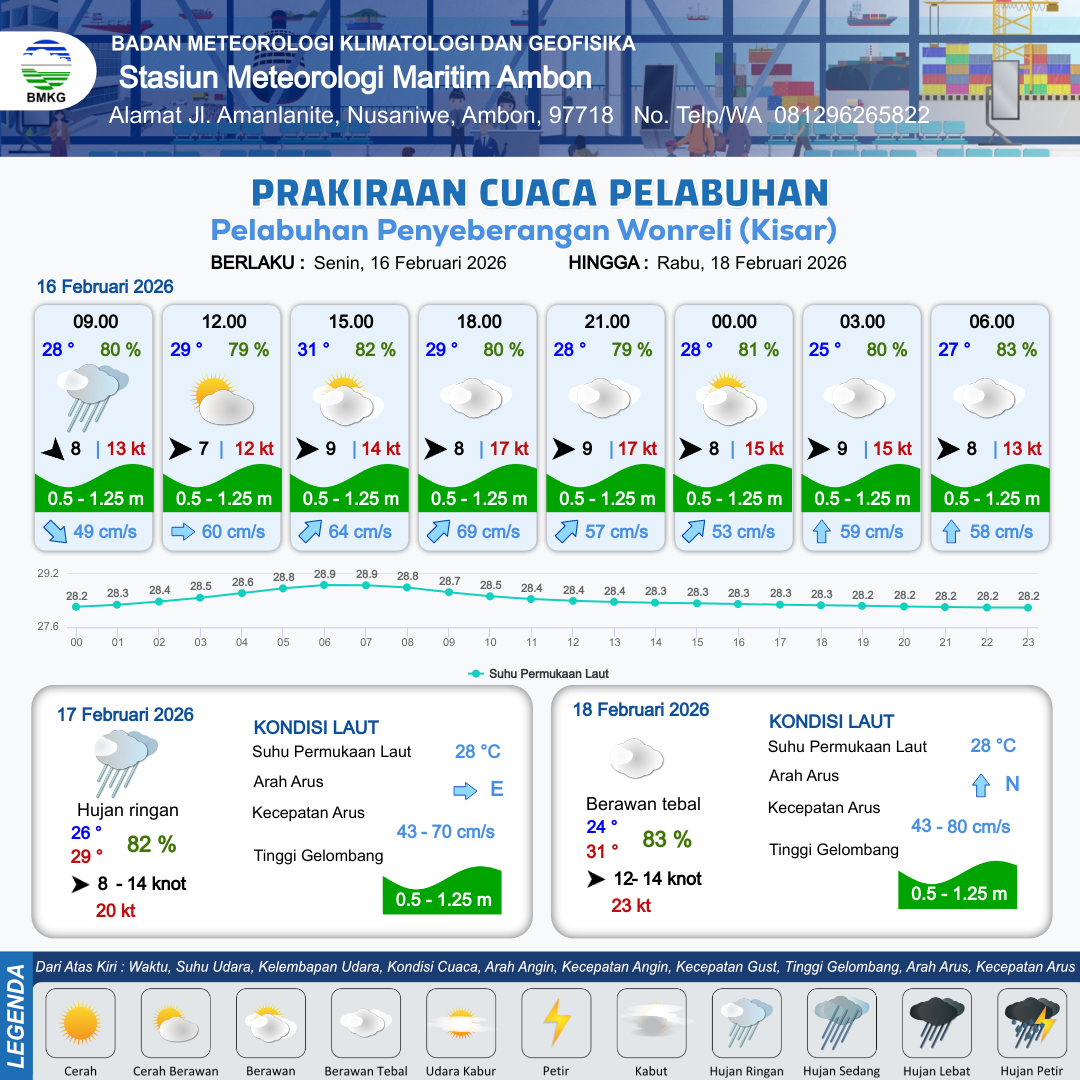 16 Feb 26, 18.00 6 jam kedepan | Barat 9 kt Gust Peningkatan kecepatan angin yang singkat dan tiba-tiba : 15 kt | 0.8 m Rendah | Utara 59.0 cm/s | 10 km | 25 °C | 80 % | +0.40 m | |