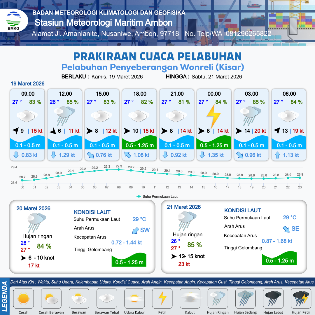 19 Mar 26, 20.00 2 jam kedepan | Berawan Tebal | Barat Daya 13 kt Gust Peningkatan kecepatan angin yang singkat dan tiba-tiba : 18 kt | | | 10 km | 27 °C | 84 % | +0.30 m |