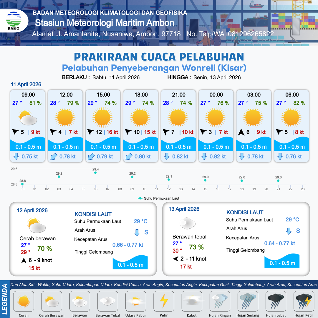 11 Apr 26, 09.00 2 jam kedepan | Tenggara 10 kt Gust Peningkatan kecepatan angin yang singkat dan tiba-tiba : 15 kt | 0.3 m Tenang | Barat Daya 0.8 Knot | 10 km | 29 °C | 74 % | +0.58 m | |