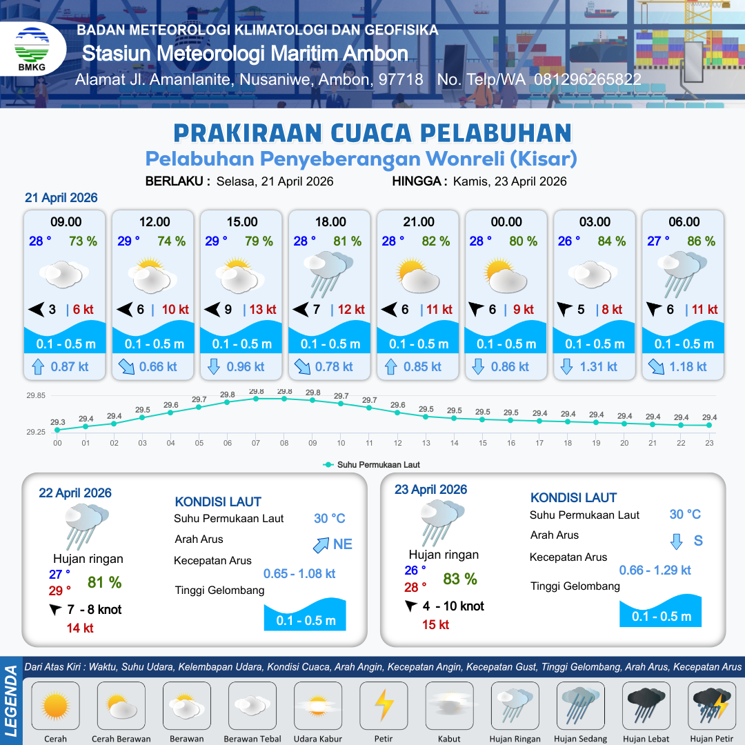 21 Apr 26, 03.00 4 jam kedepan | Tenggara 3 kt Gust Peningkatan kecepatan angin yang singkat dan tiba-tiba : 8 kt | 0.2 m Tenang | Tenggara 0.6 Knot | 10 km | 29 °C | 73 % | -0.28 m | |