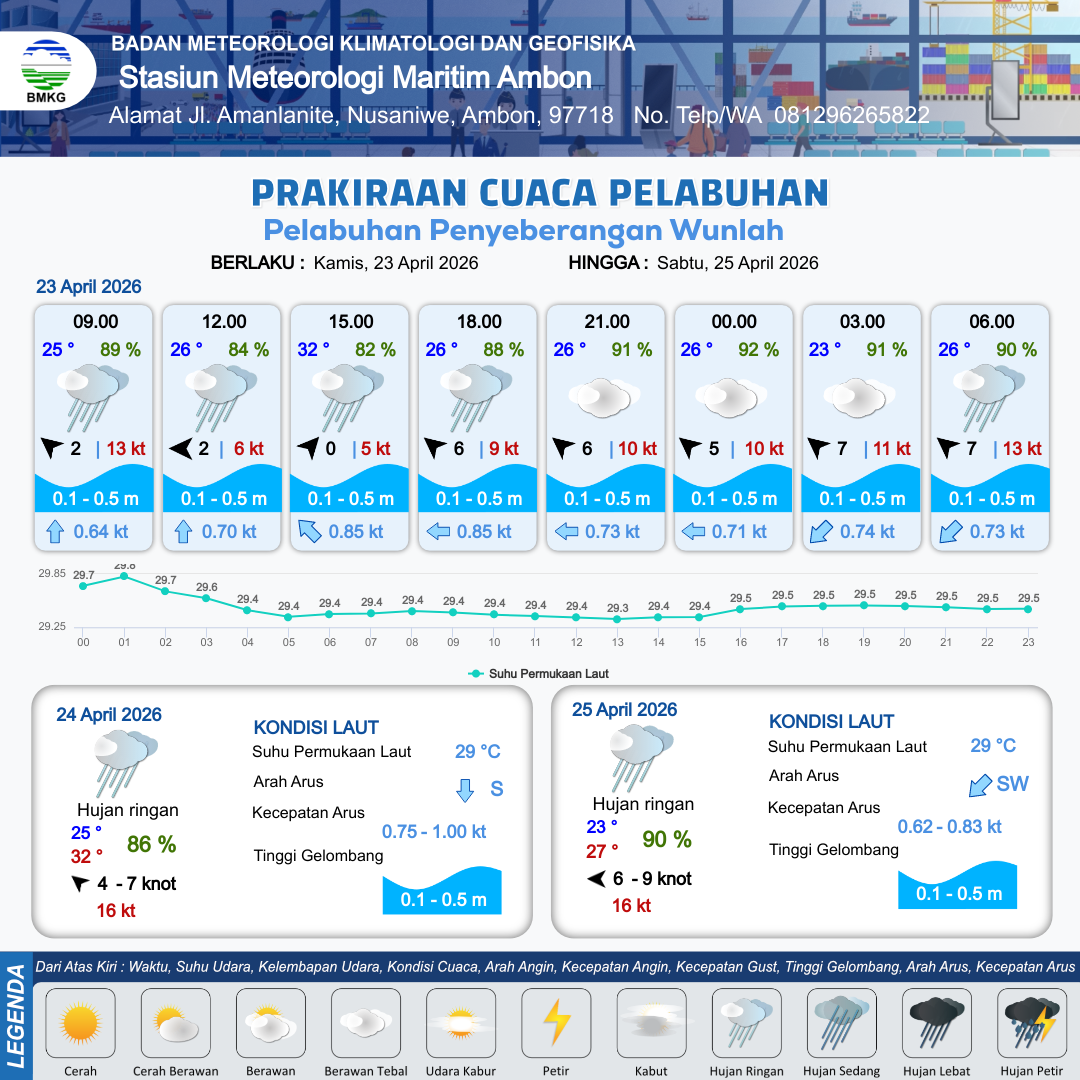 23 Apr 26, 06.00 23 jam kedepan | Barat Daya 0 kt Gust Peningkatan kecepatan angin yang singkat dan tiba-tiba : 5 kt | 0.1 m Tenang | Barat Laut 0.8 Knot | 5 km | 32 °C | 82 % | +0.16 m | |