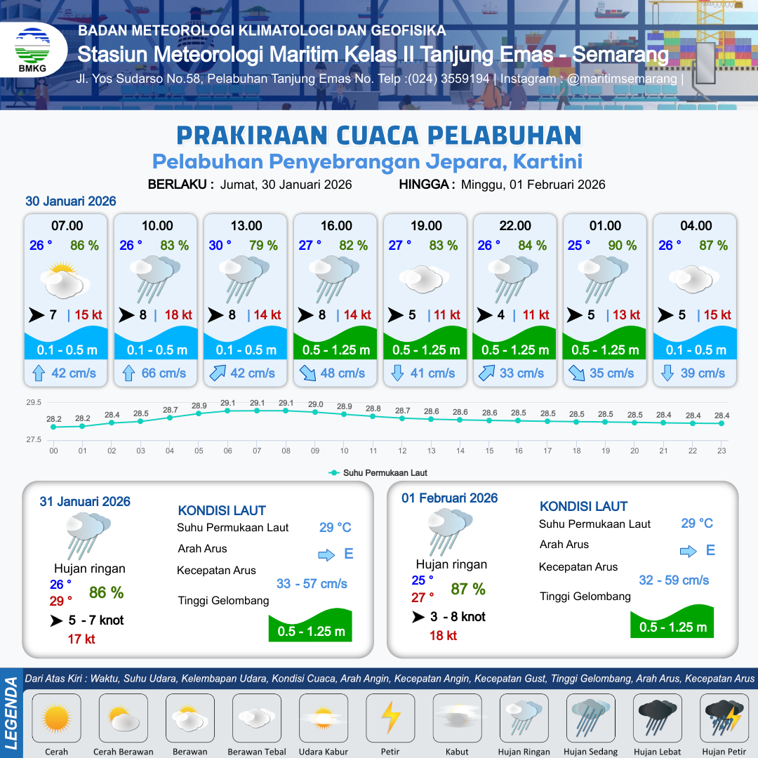 30 Jan 26, 06.00 12 jam yang lalu | Hujan Ringan | Barat 8 kt Gust Peningkatan kecepatan angin yang singkat dan tiba-tiba : 14 kt | | | 7 km | 30 °C | 79 % | -0.40 m |