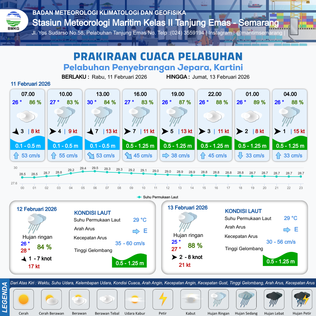 11 Feb 26, 03.00 3 jam kedepan | Barat 4 kt Gust Peningkatan kecepatan angin yang singkat dan tiba-tiba : 9 kt | 0.5 m Rendah | Utara 55.0 cm/s | 7 km | 27 °C | 83 % | -0.41 m | |