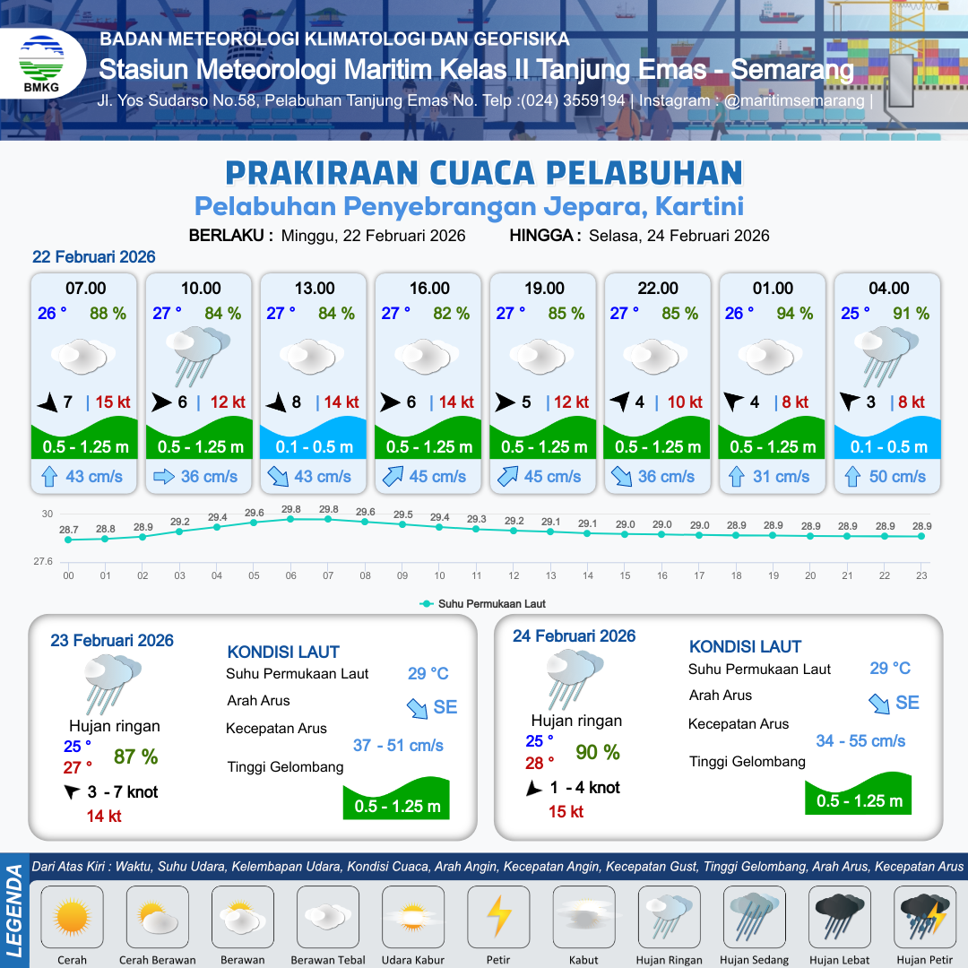 22 Feb 26, 03.00 15 jam yang lalu | Hujan Ringan | Barat 6 kt Gust Peningkatan kecepatan angin yang singkat dan tiba-tiba : 12 kt | | | 5 km | 27 °C | 84 % | -0.16 m |