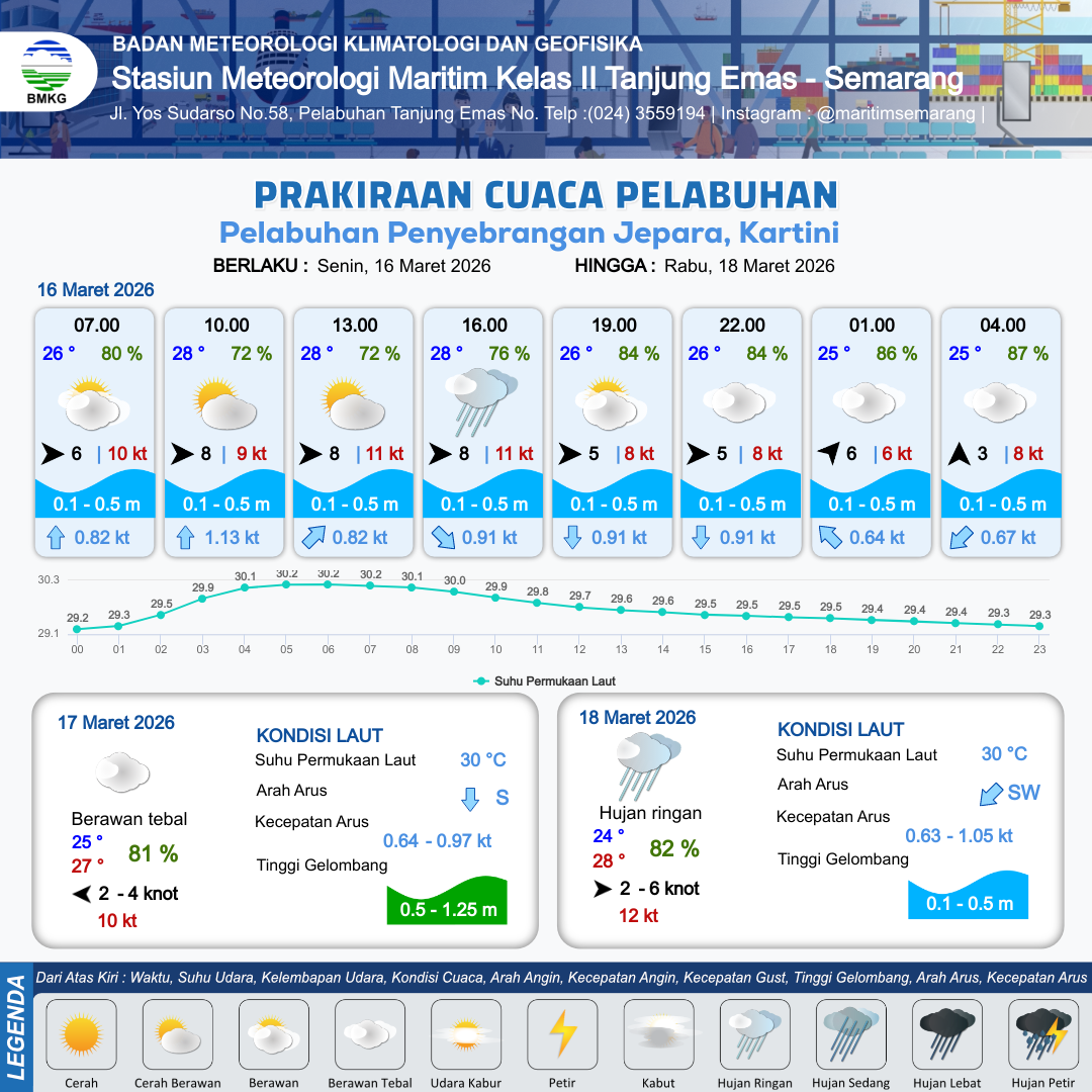 16 Mar 26, 03.00 16 jam yang lalu | Cerah Berawan | Barat 8 kt Gust Peningkatan kecepatan angin yang singkat dan tiba-tiba : 9 kt | | | 10 km | 28 °C | 72 % | -0.10 m |