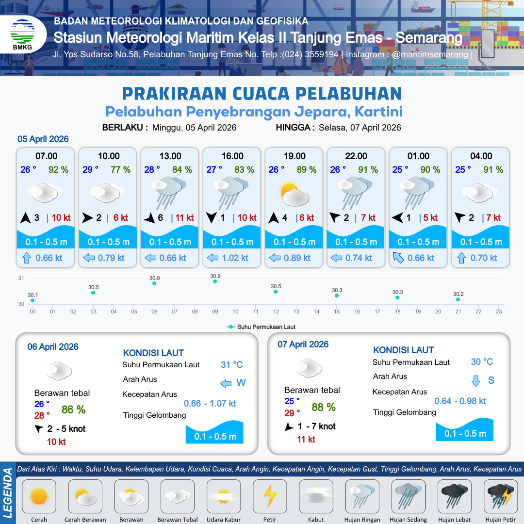 5 Apr 26, 12.00 7 jam yang lalu | Cerah Berawan | Selatan 4 kt Gust Peningkatan kecepatan angin yang singkat dan tiba-tiba : 6 kt | | | 10 km | 26 °C | 89 % | +0.59 m |