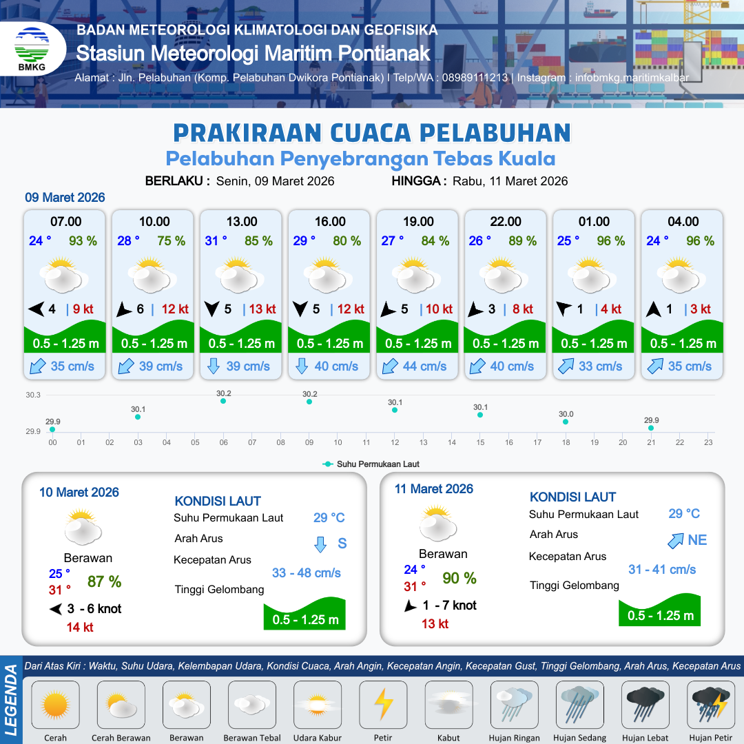 9 Mar 26, 21.00 2 jam kedepan | Berawan | Selatan 1 kt Gust Peningkatan kecepatan angin yang singkat dan tiba-tiba : 3 kt | | | 10 km | 24 °C | 96 % | +0.10 m |