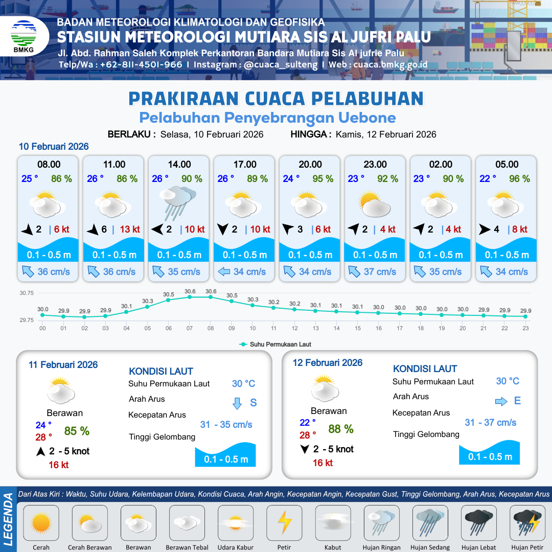9 Feb 26, 08.00 10 jam yang lalu | Berawan Tebal | Timur Laut 2 kt Gust Peningkatan kecepatan angin yang singkat dan tiba-tiba : 10 kt | | | 9 km | 26 °C | 80 % | +0.11 m |