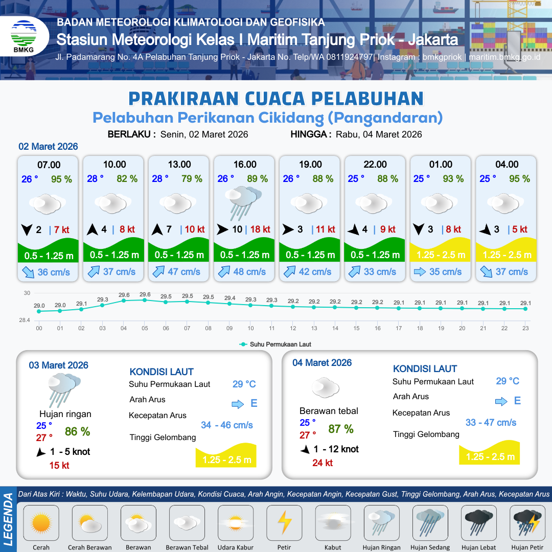 2 Mar 26, 16.00 2 jam kedepan | Barat Laut 4 kt Gust Peningkatan kecepatan angin yang singkat dan tiba-tiba : 12 kt | 1.3 m Sedang | Tenggara 34.0 cm/s | 7 km | 25 °C | 90 % | -0.02 m | |