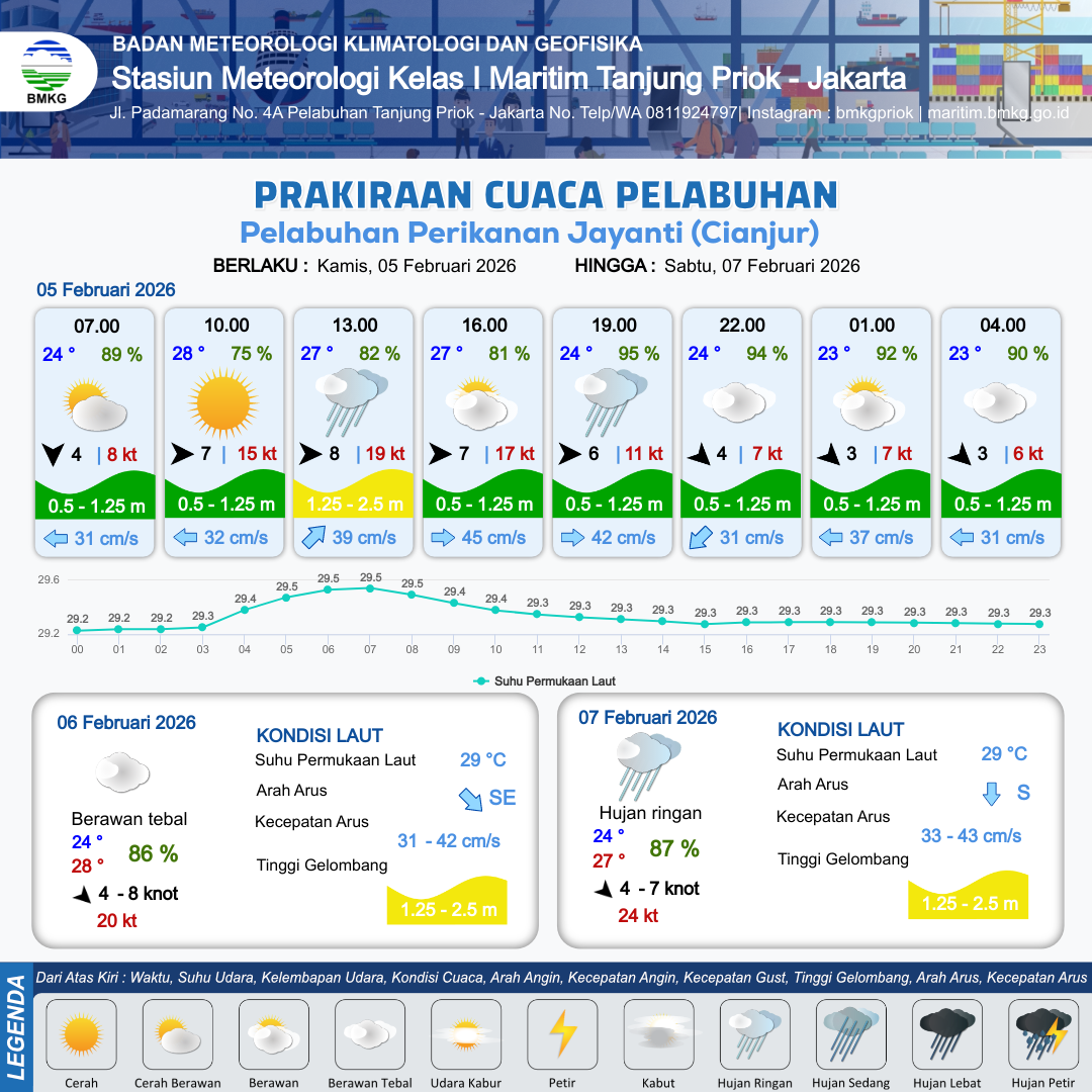 5 Feb 26, 04.00 6 jam kedepan | Barat 7 kt Gust Peningkatan kecepatan angin yang singkat dan tiba-tiba : 19 kt | 1.1 m Rendah | Timur Laut 32.0 cm/s | 10 km | 28 °C | 82 % | +0.41 m | |