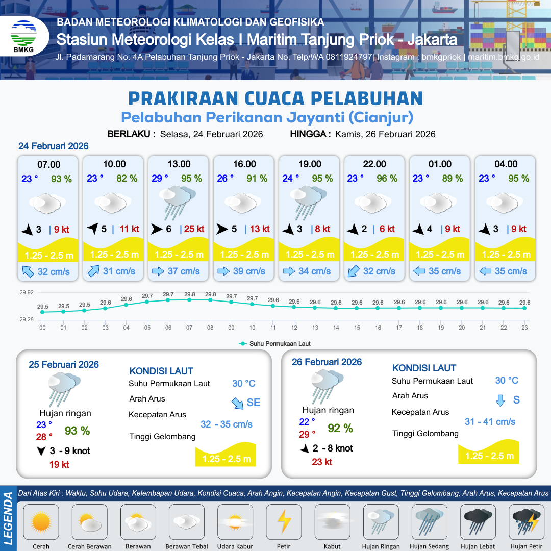 24 Feb 26, 06.00 12 jam yang lalu | Hujan Ringan | Barat 6 kt Gust Peningkatan kecepatan angin yang singkat dan tiba-tiba : 25 kt | | | 7 km | 29 °C | 95 % | +0.66 m |