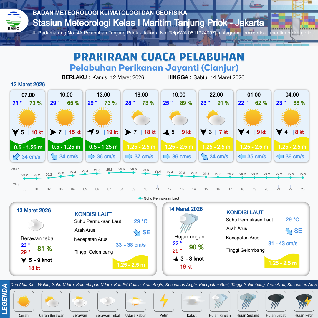 12 Mar 26, 12.00 2 jam kedepan | Barat Laut 5 kt Gust Peningkatan kecepatan angin yang singkat dan tiba-tiba : 9 kt | 1.3 m Sedang | Timur 36.0 cm/s | 10 km | 25 °C | 89 % | -0.19 m | |