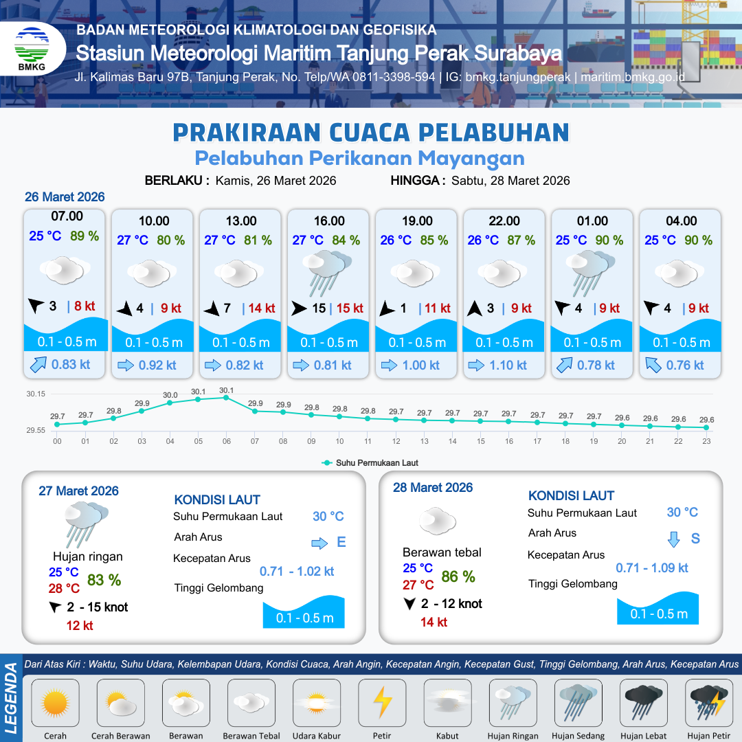 26 Mar 26, 23.00 4 jam kedepan | Hujan Ringan | Tenggara 3 kt Gust Peningkatan kecepatan angin yang singkat dan tiba-tiba : 9 kt | | | 10 km | 25 °C | 90 % | +0.51 m |