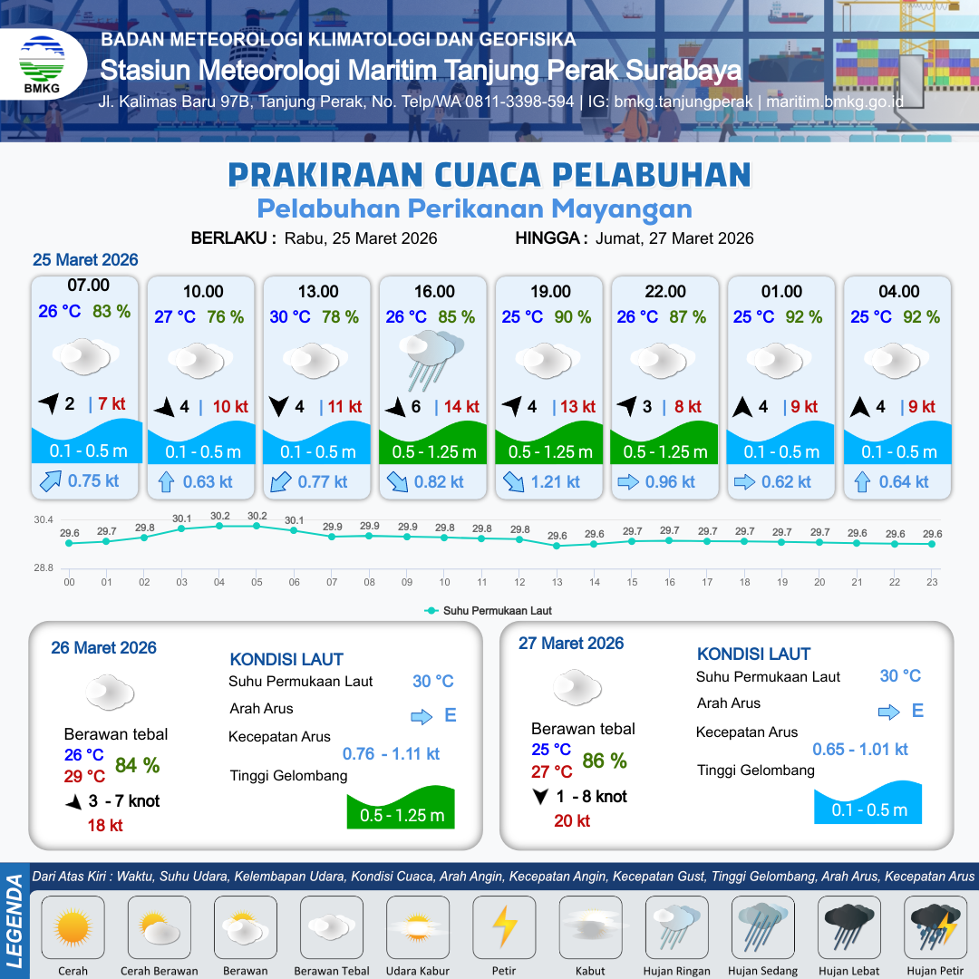 25 Mar 26, 22.00 5 jam kedepan | Berawan Tebal | Selatan 4 kt Gust Peningkatan kecepatan angin yang singkat dan tiba-tiba : 10 kt | | | 10 km | 25 °C | 92 % | +0.56 m |