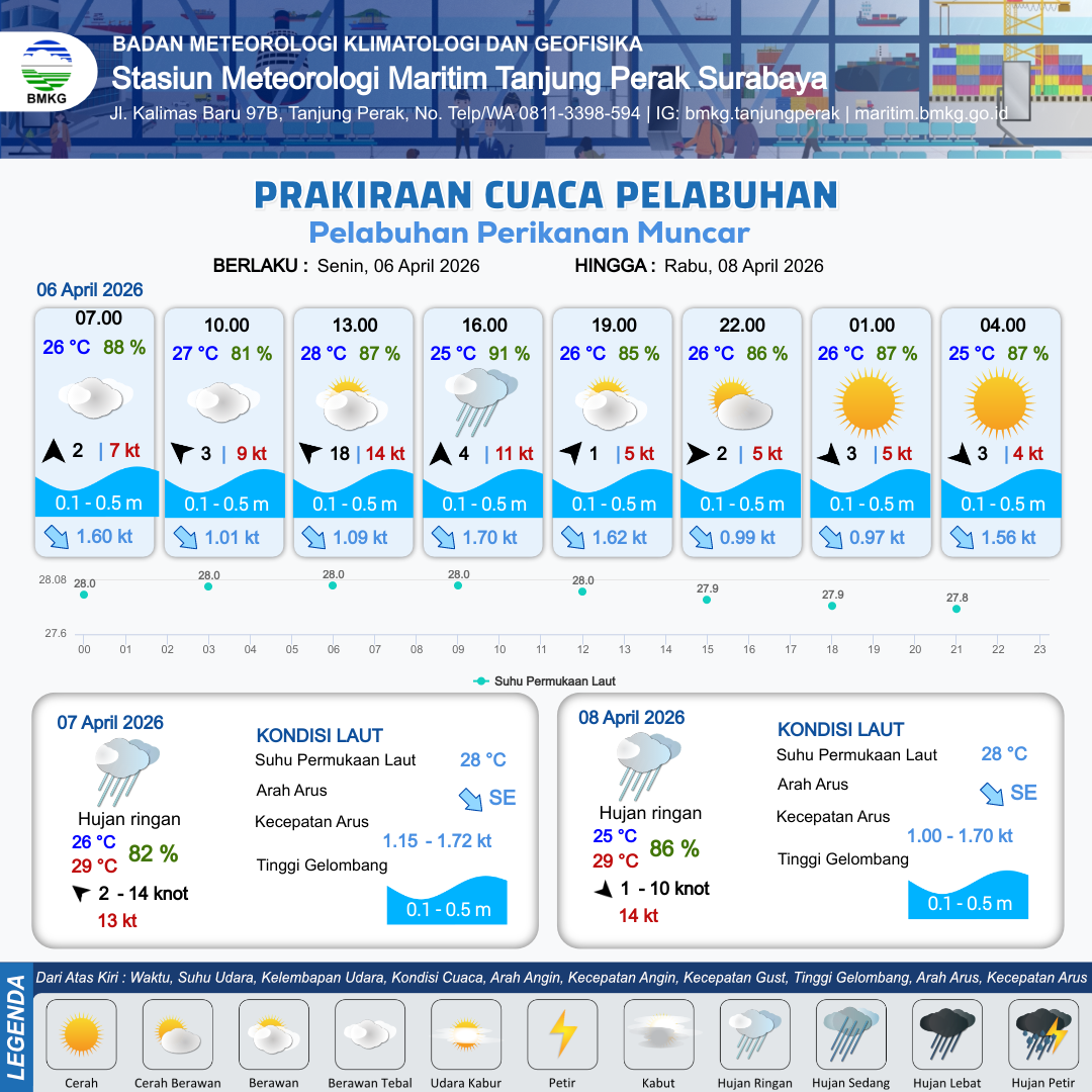 6 Apr 26, 23.00 4 jam kedepan | Cerah | Barat 2 kt Gust Peningkatan kecepatan angin yang singkat dan tiba-tiba : 5 kt | | | 10 km | 26 °C | 85 % | +0.41 m |
