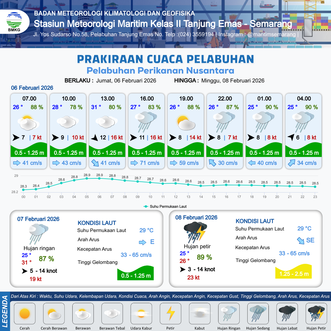 6 Feb 26, 03.00 5 jam kedepan | Barat 9 kt Gust Peningkatan kecepatan angin yang singkat dan tiba-tiba : 10 kt | 0.6 m Rendah | Timur 43.0 cm/s | 10 km | 28 °C | 78 % | -0.35 m | |