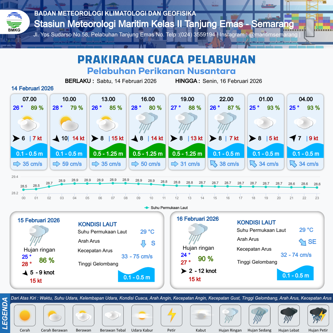 14 Feb 26, 09.00 12 jam yang lalu | Hujan Ringan | Barat Laut 8 kt Gust Peningkatan kecepatan angin yang singkat dan tiba-tiba : 9 kt | | | 10 km | 28 °C | 80 % | -0.03 m |