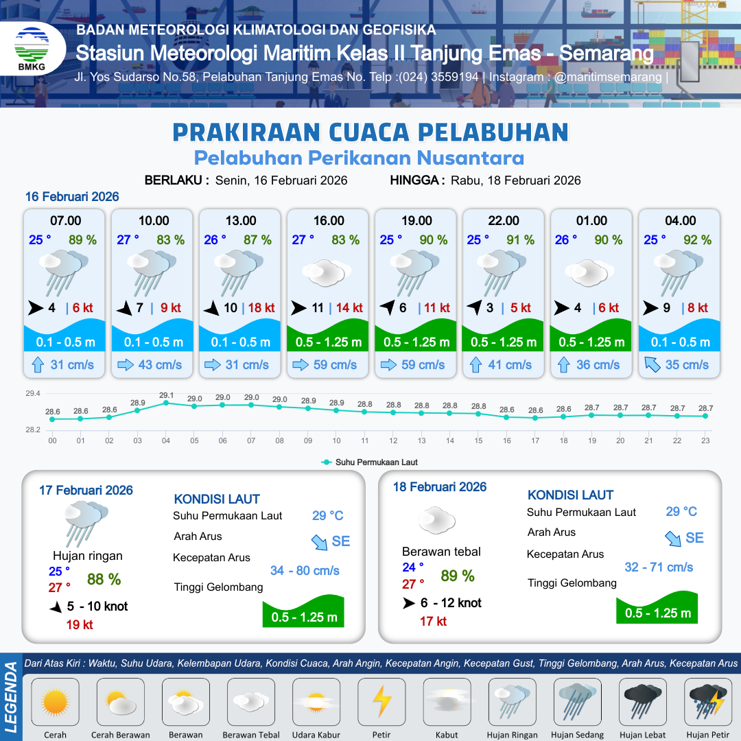 16 Feb 26, 22.00 8 jam kedepan | Barat 9 kt Gust Peningkatan kecepatan angin yang singkat dan tiba-tiba : 8 kt | 0.5 m Rendah | Utara 33.0 cm/s | 5 km | 25 °C | 92 % | -0.33 m | |