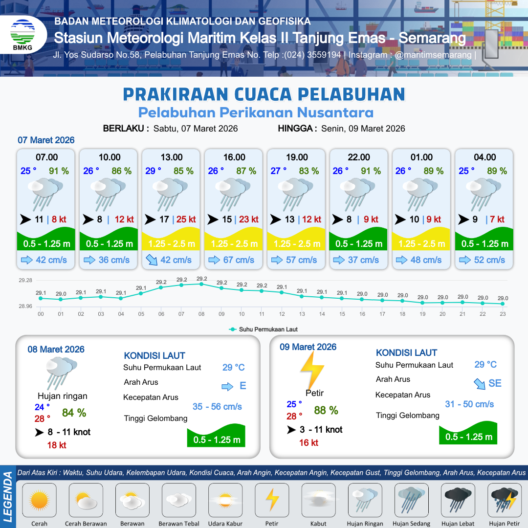 7 Mar 26, 15.00 2 jam kedepan | Barat 8 kt Gust Peningkatan kecepatan angin yang singkat dan tiba-tiba : 9 kt | 1.1 m Rendah | Timur 37.0 cm/s | 6 km | 26 °C | 91 % | +0.12 m | |