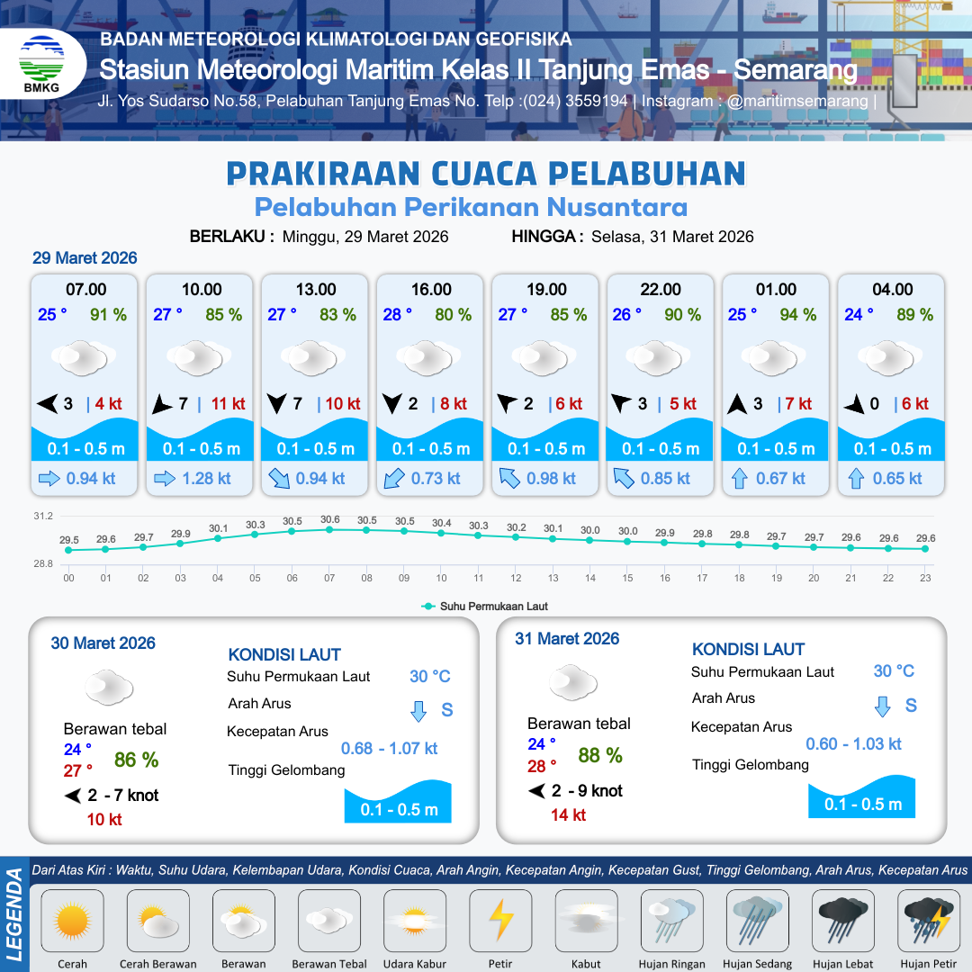 29 Mar 26, 22.00 5 jam kedepan | Barat Laut 0 kt Gust Peningkatan kecepatan angin yang singkat dan tiba-tiba : 4 kt | 0.1 m Tenang | Barat Laut 0.7 Knot | 8 km | 24 °C | 90 % | -0.05 m | |