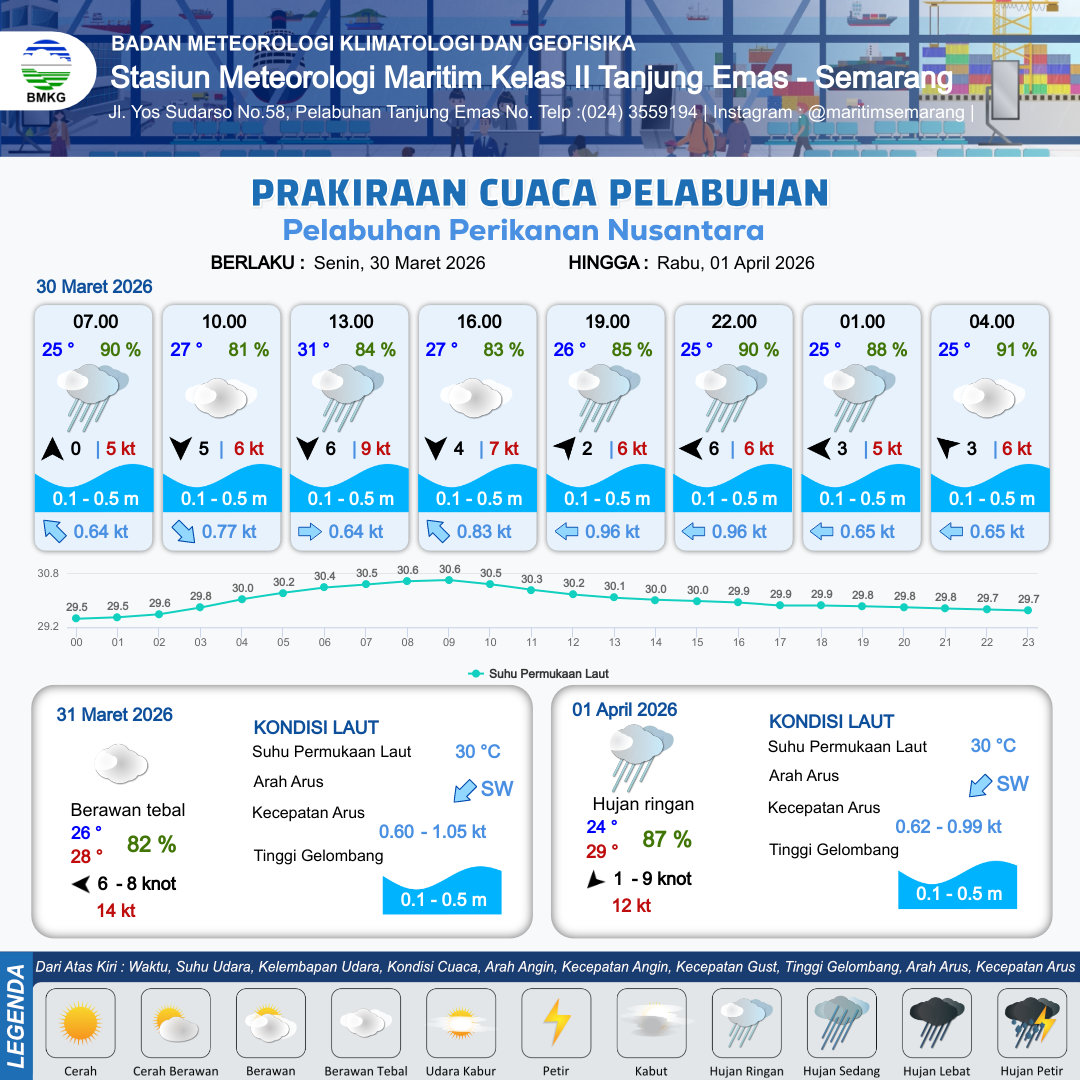 30 Mar 26, 08.00 4 jam kedepan | Utara 4 kt Gust Peningkatan kecepatan angin yang singkat dan tiba-tiba : 7 kt | 0.3 m Tenang | Utara 0.7 Knot | 9 km | 27 °C | 81 % | -0.04 m | |