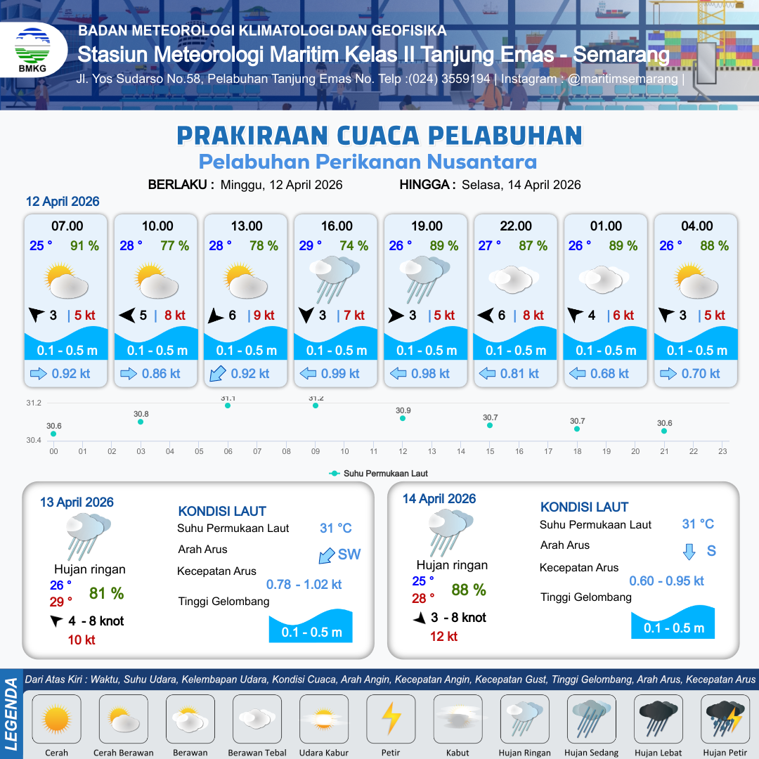 12 Apr 26, 21.00 12 jam kedepan | Tenggara 3 kt Gust Peningkatan kecepatan angin yang singkat dan tiba-tiba : 5 kt | 0.3 m Tenang | Timur 0.7 Knot | 8 km | 26 °C | 88 % | +0.61 m | |