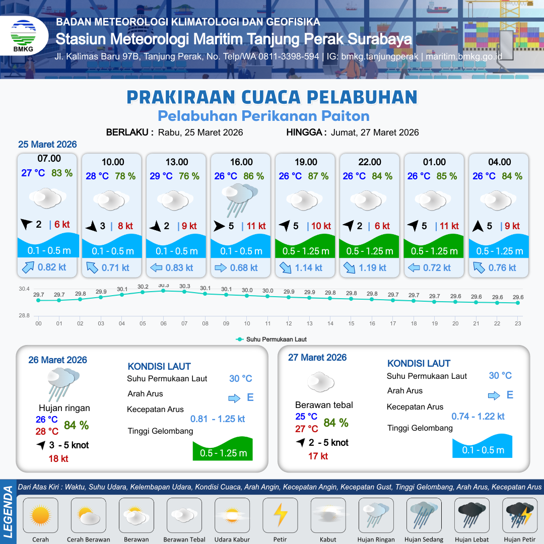 25 Mar 26, 08.00 2 jam kedepan | Barat 5 kt Gust Peningkatan kecepatan angin yang singkat dan tiba-tiba : 12 kt | 0.3 m Tenang | Barat Laut 0.6 Knot | 7 km | 28 °C | 81 % | +0.79 m | |