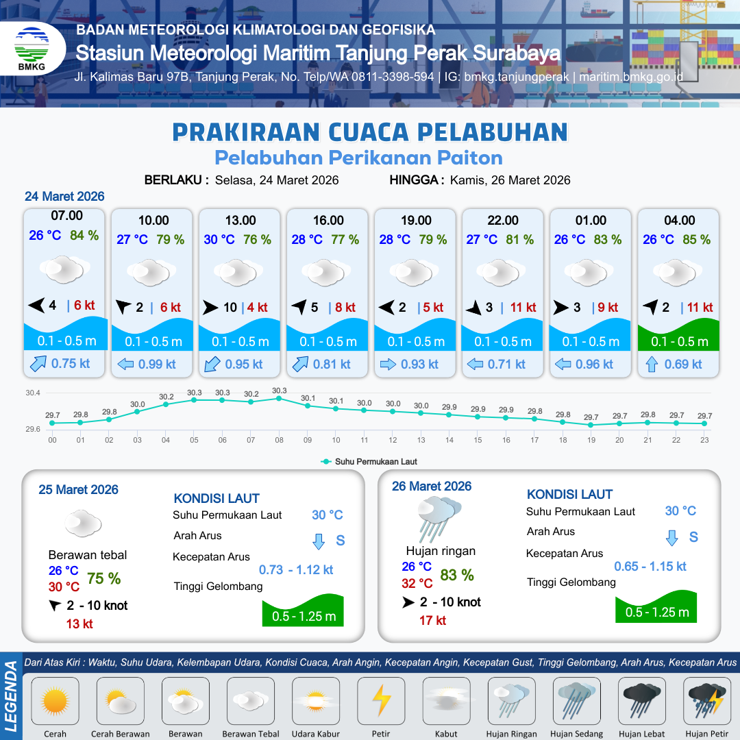 24 Mar 26, 08.00 4 jam kedepan | Barat Daya 5 kt Gust Peningkatan kecepatan angin yang singkat dan tiba-tiba : 9 kt | 0.2 m Tenang | Selatan 0.7 Knot | 10 km | 29 °C | 76 % | +0.97 m | |