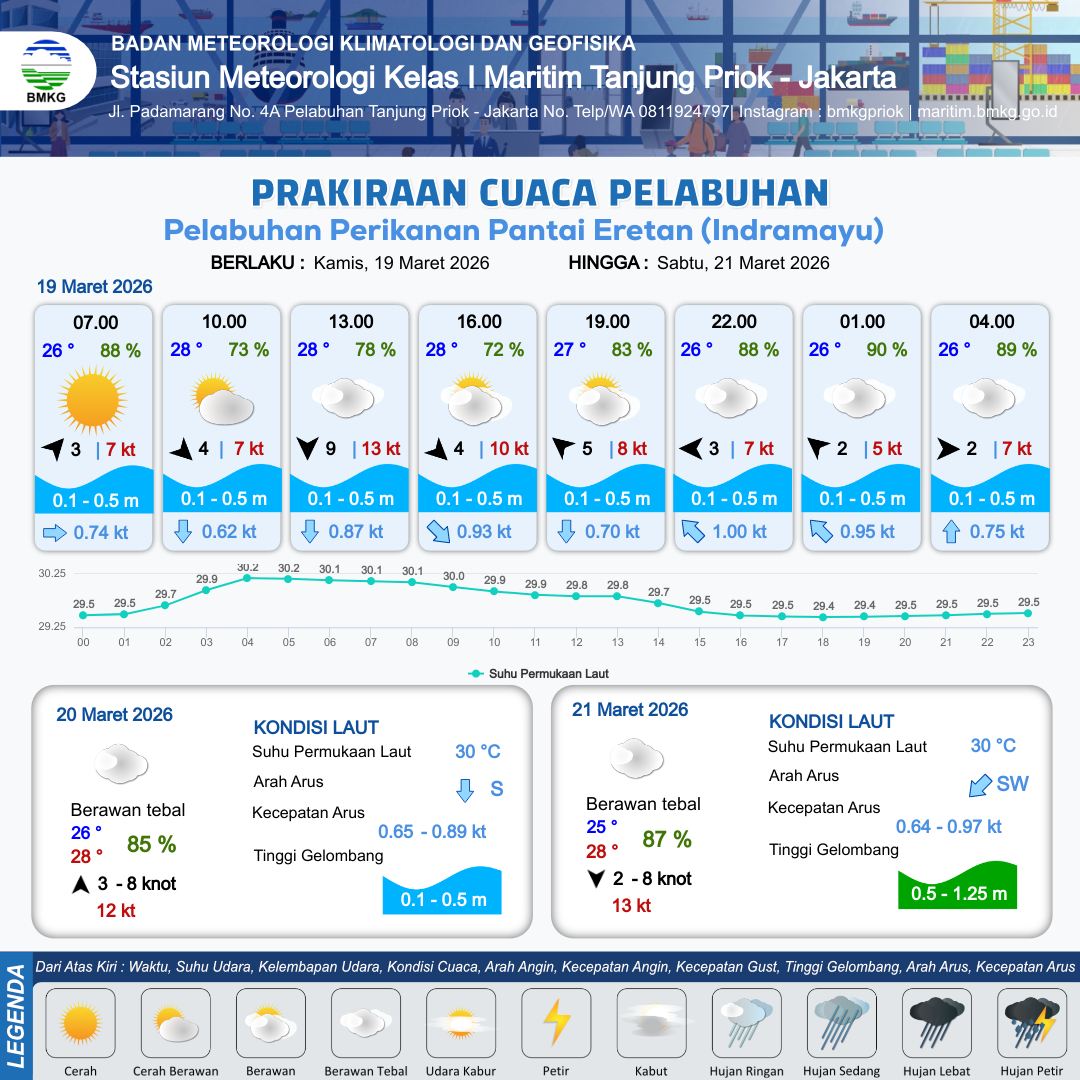 18 Mar 26, 23.00 2 jam kedepan | Berawan Tebal | Selatan 3 kt Gust Peningkatan kecepatan angin yang singkat dan tiba-tiba : 6 kt | | | 8 km | 26 °C | 88 % | -0.19 m |