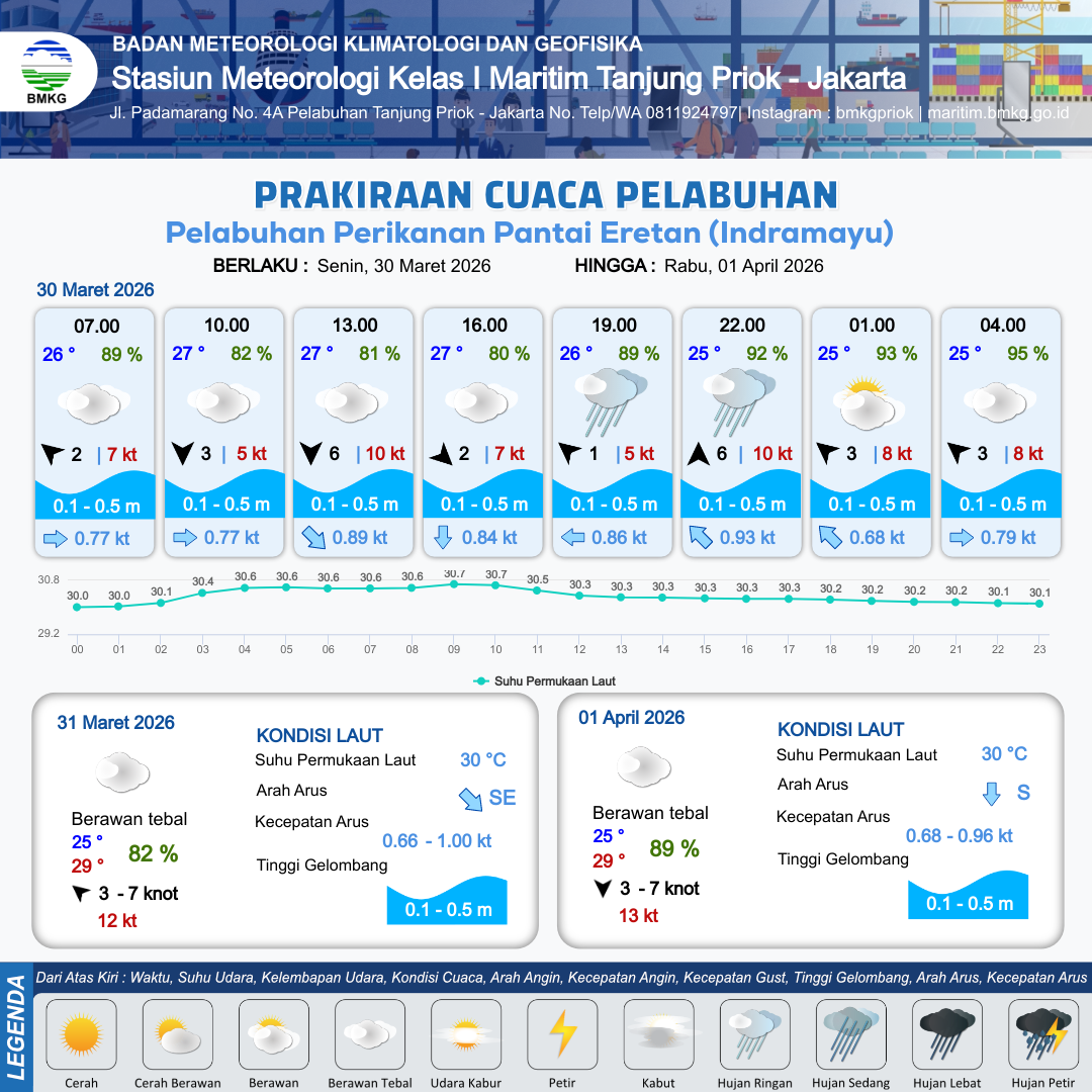 30 Mar 26, 23.00 13 jam kedepan | Tenggara 3 kt Gust Peningkatan kecepatan angin yang singkat dan tiba-tiba : 8 kt | 0.2 m Tenang | Timur 0.8 Knot | 8 km | 25 °C | 95 % | -0.06 m |