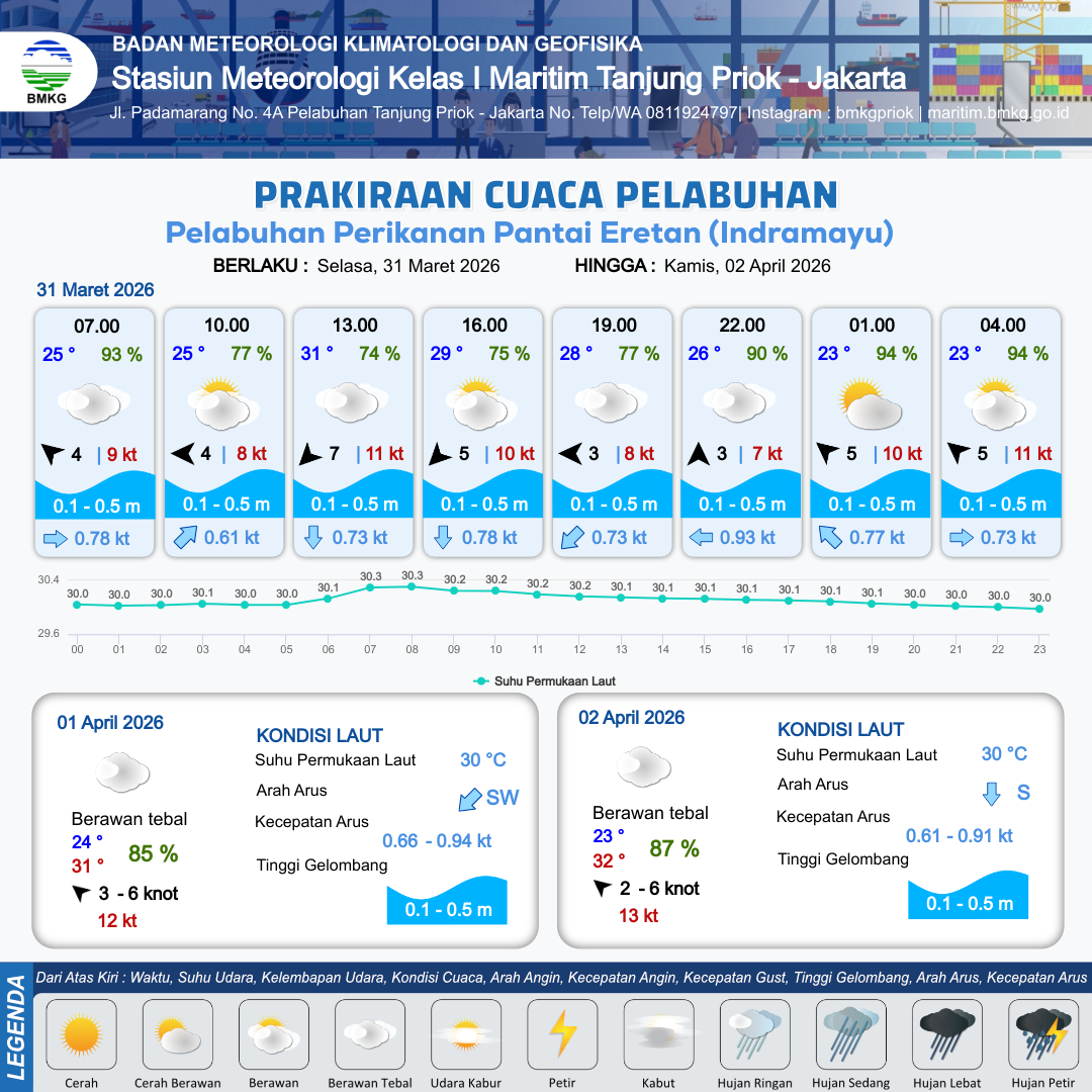 31 Mar 26, 23.00 2 jam kedepan | Berawan | Tenggara 4 kt Gust Peningkatan kecepatan angin yang singkat dan tiba-tiba : 10 kt | | | 10 km | 25 °C | 93 % | -0.26 m |